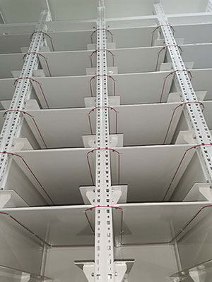 敷設(shè)光纜時(shí),貨格里面、貨格與貨格之間的光纜應(yīng)該處于比較緊湊的狀態(tài),保證每個(gè)貨格的光纜長(zhǎng)度一致,如下圖: