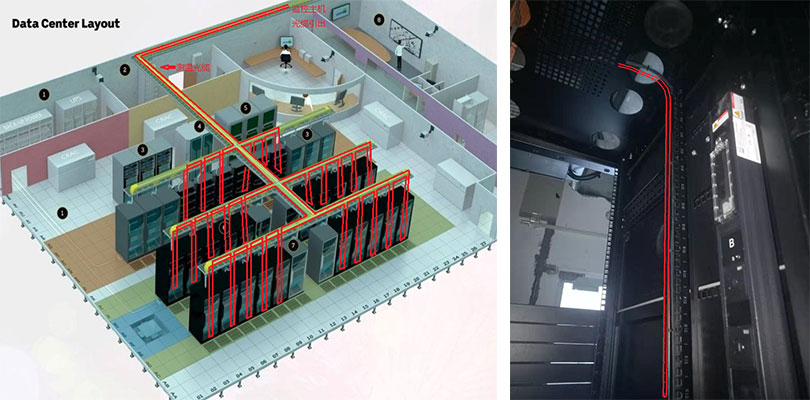 感溫探測(cè)光纜采用“幾”字形分別覆蓋敷設(shè)至機(jī)柜內(nèi)用于監(jiān)測(cè)機(jī)柜內(nèi)機(jī)架排實(shí)時(shí)溫度;使用扎帶將測(cè)溫光纜固定在機(jī)柜內(nèi);