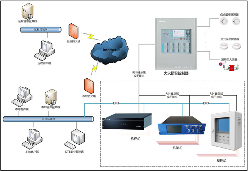 采用分布式光纖測(cè)溫系統(tǒng)監(jiān)測(cè)機(jī)房溫度,測(cè)溫主機(jī)可通過感溫光纜監(jiān)控設(shè)備溫度及室內(nèi)環(huán)境溫度,實(shí)現(xiàn)數(shù)據(jù)中心溫度實(shí)時(shí)測(cè)量,并實(shí)時(shí)進(jìn)行定溫、差溫報(bào)警判斷和光纖斷纖及系統(tǒng)故障判斷,溫度報(bào)警信息和故障報(bào)警信息可以通過界面板的LED指示,并發(fā)出相應(yīng)的報(bào)警聲音信號(hào)。通過數(shù)據(jù)接口與工控機(jī)及本地CRT相連,可以實(shí)時(shí)讀取測(cè)溫主機(jī)的溫度分布曲線和報(bào)警狀態(tài)信息,通過繼電器單元輸出至火災(zāi)報(bào)警控制器上。測(cè)溫主機(jī)通過以太網(wǎng)口可與中央監(jiān)控室的監(jiān)測(cè)系統(tǒng)相連,實(shí)時(shí)將現(xiàn)場溫度信息傳輸至中央監(jiān)控室。