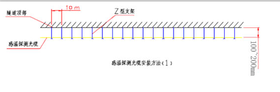 探測(cè)光纜的安裝,沿著隧道的頂部直線敷設(shè)的方式,距頂部100~200mm,以保持良好的通風(fēng)和溫度響應(yīng)。安裝時(shí)先敷設(shè)一根鋼絲繩,同時(shí)采用Z型安裝支架將其固定,安裝支架之間距離為10m;然后用金屬扎帶將光纜固定在鋼絲繩上,金屬扎帶的間隔1.5m,如下圖所示。